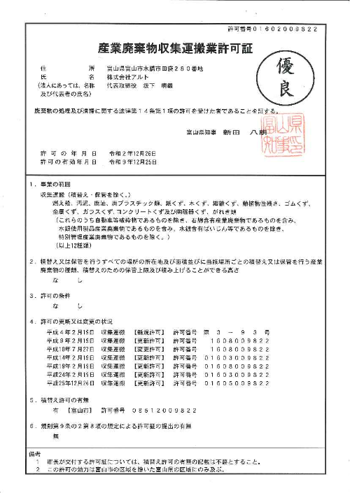 - 富山県産業廃棄物収集運搬業の優良認定を取得