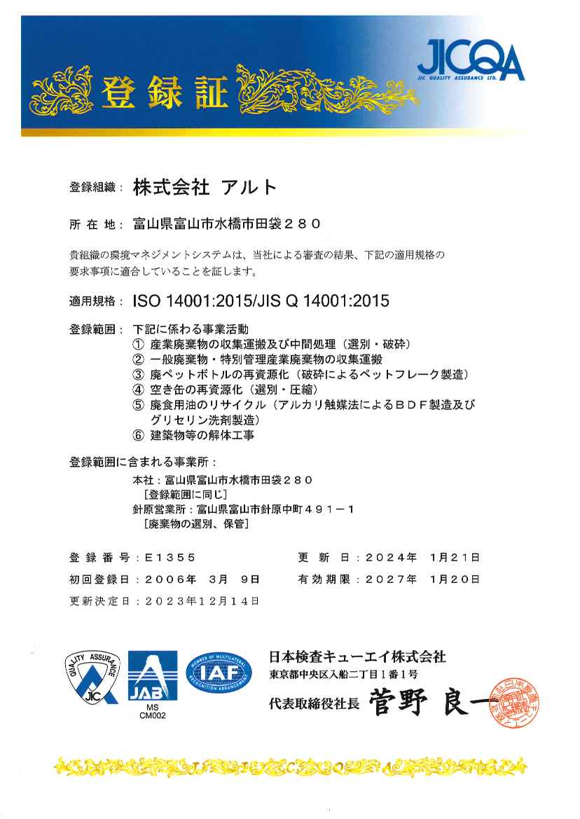- ISO14001/2015年版への移行 認証取得