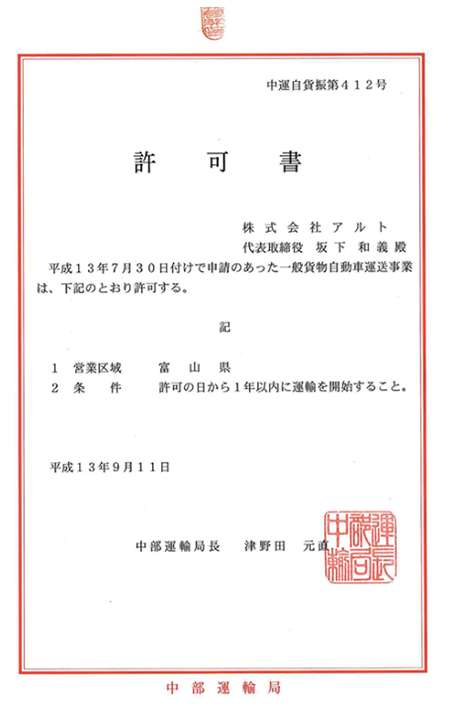 平成13年9月11日 交付一般貨物自動車