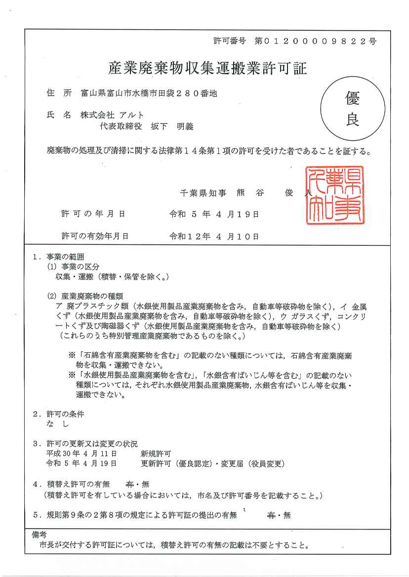 - 千葉県産業廃棄物収集運搬業 許可取得