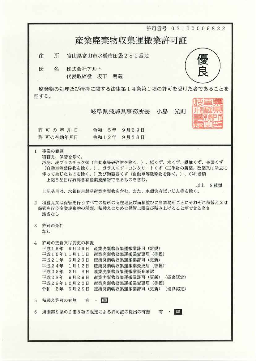 - 岐阜県産業廃棄物収集運搬業の優良認定を取得