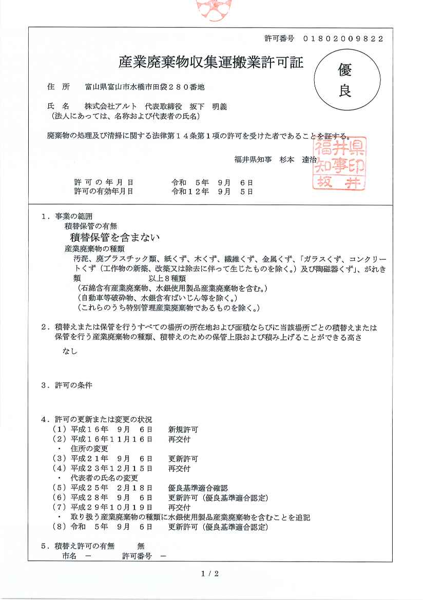 - 福井県産業廃棄物収集運搬業の優良認定を取得