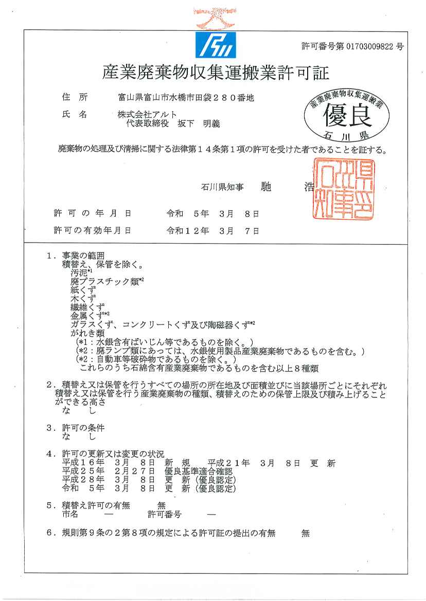 - 石川県産業廃棄物収集運搬業の優良認定を取得