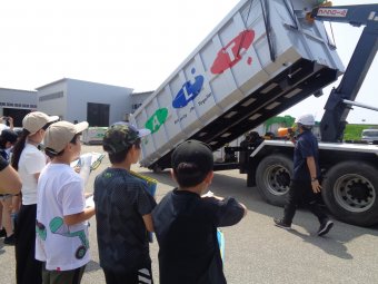 車両の説明では、パッカー車のごみの積み込み方や排出の仕方を実演、普段見ることがない作業風景に皆さん興味を示しておられました。