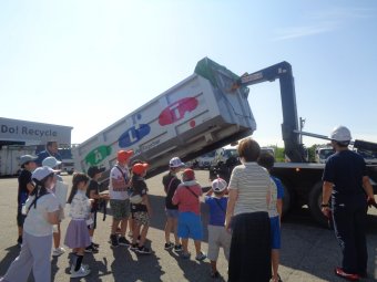 見学を通して、ペットボトルキャップが衣服やペットボトルなどに再生されることや、普段は目にすることのできないトラックの迫力にとても驚いておられました。捨てるとゴミになってしまうプラスチックも、しっかり分別してリサイクルをすると立派な資源として生まれ変わることを知っていただけたと思います。