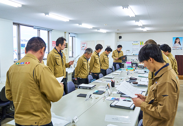 弊社では、入社時に作業や機械操作に関する研修を実施し、その後も定期的な安全研修を行うことで、全社員が安全に業務を行えるよう教育を徹底しています。また、車両・フォークリフト・重機などの運転操作は、すべて有資格者が担当し、全社員が交通法規や各種法令・規則を順守して安全作業に取り組んでいます。